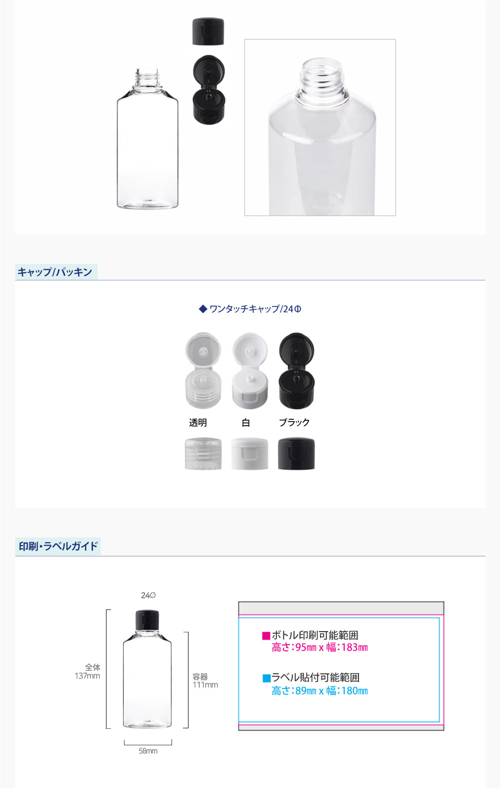 容量:250ml / 口径 : 24φ / 高さ:137mm / 直径 : 58mm