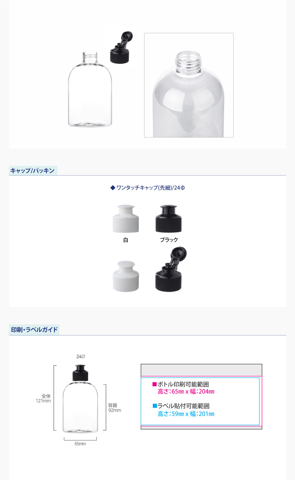容量:250ml / 口径 : 24φ / 高さ:121mm / 直径 : 65mm