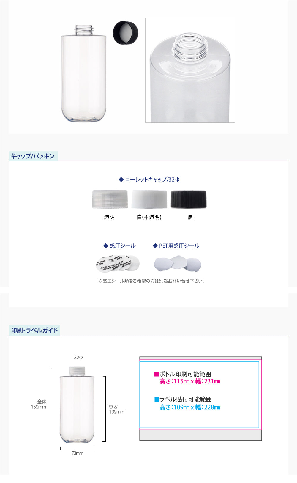 容量:500ml / 口径 : 32φ / 高さ:159mm / 直径 : 73mm