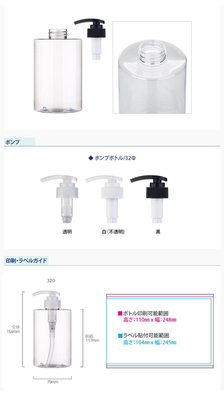 容量:500ml / 口径 : 32φ / 高さ:154mm / 直径 : 79mm