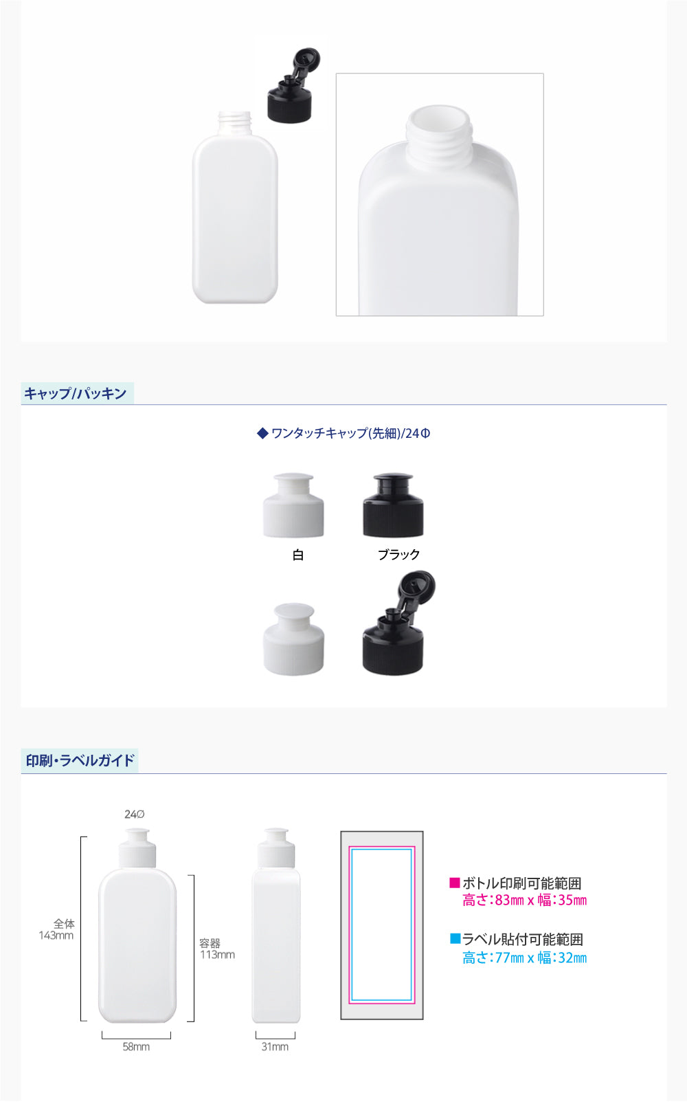 容量:150ml / 口径 : 24φ / 高さ:143mm / 幅 : 58mm / 奥行 : 31mm