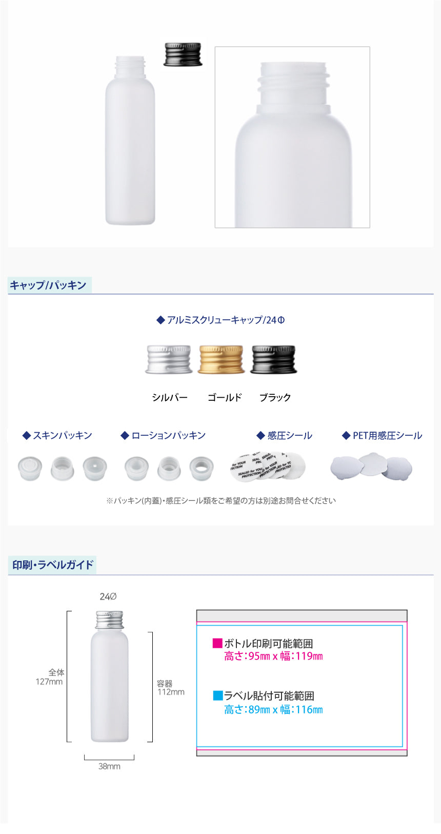 容量:100ml / 口径 : 24φ / 高さ:127mm / 直径 : 38mm