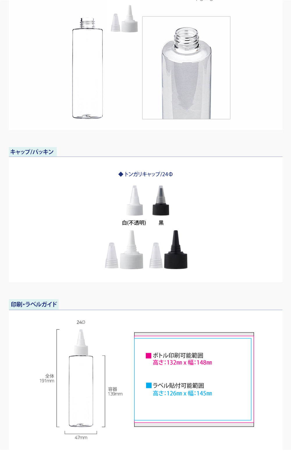 容量:200ml / 口径 : 24φ / 高さ:191mm / 直径 : 47mm