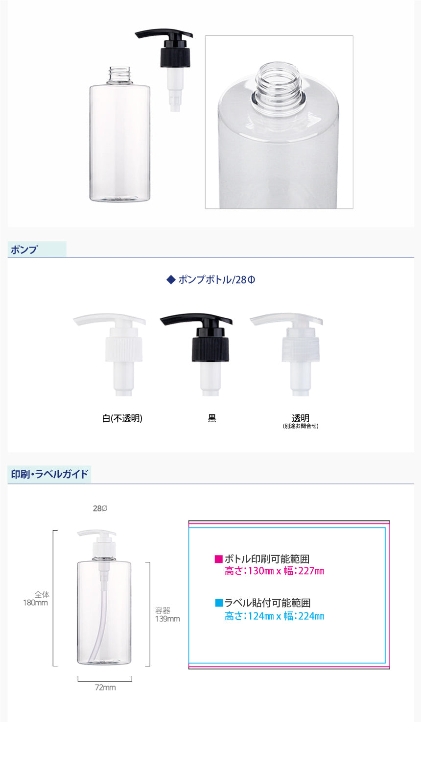 容量:500ml / 口径 : 28φ / 高さ:180mm / 直径 : 72mm