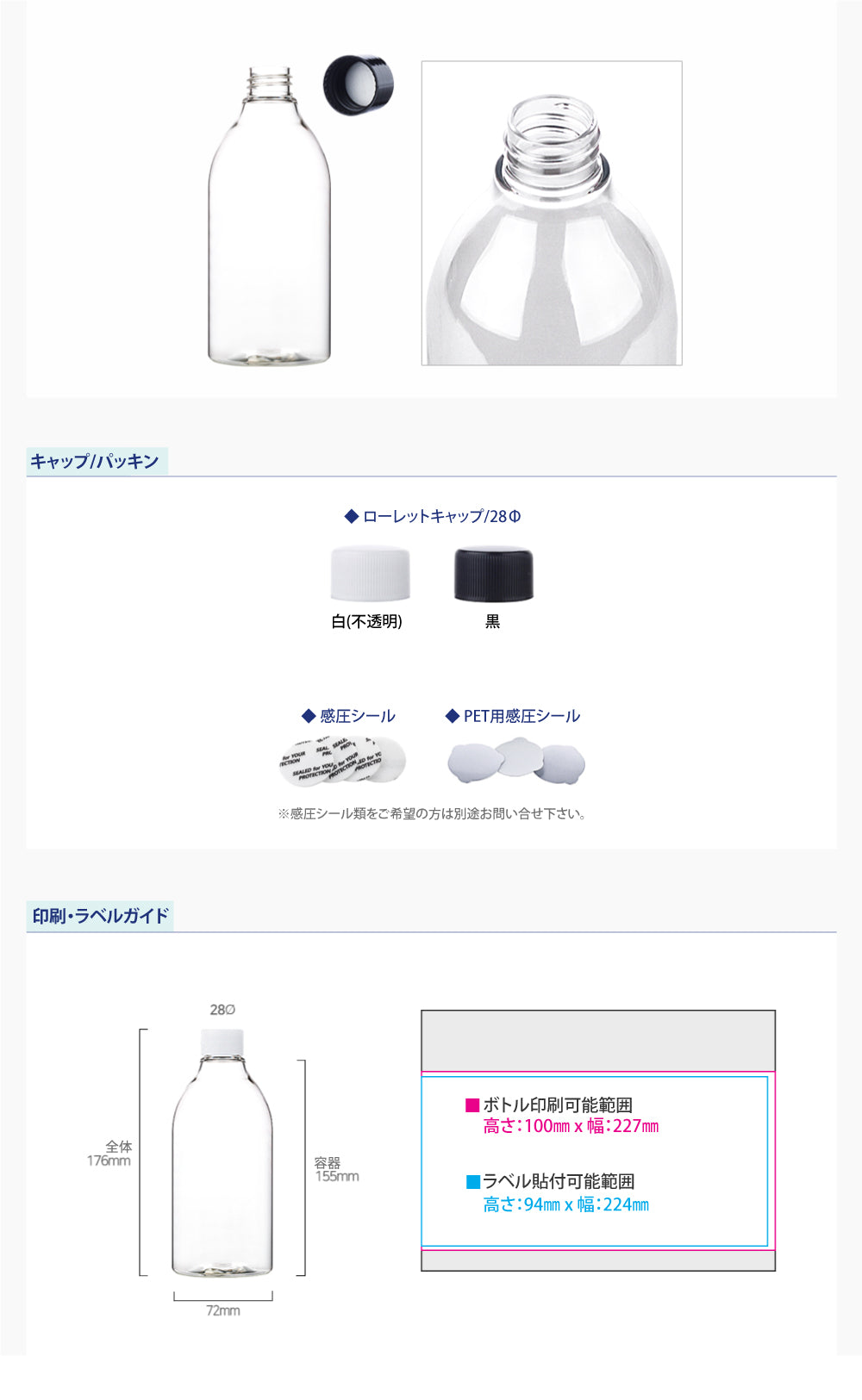 容量:500ml / 口径 : 28φ / 高さ:176mm / 直径 : 72mm