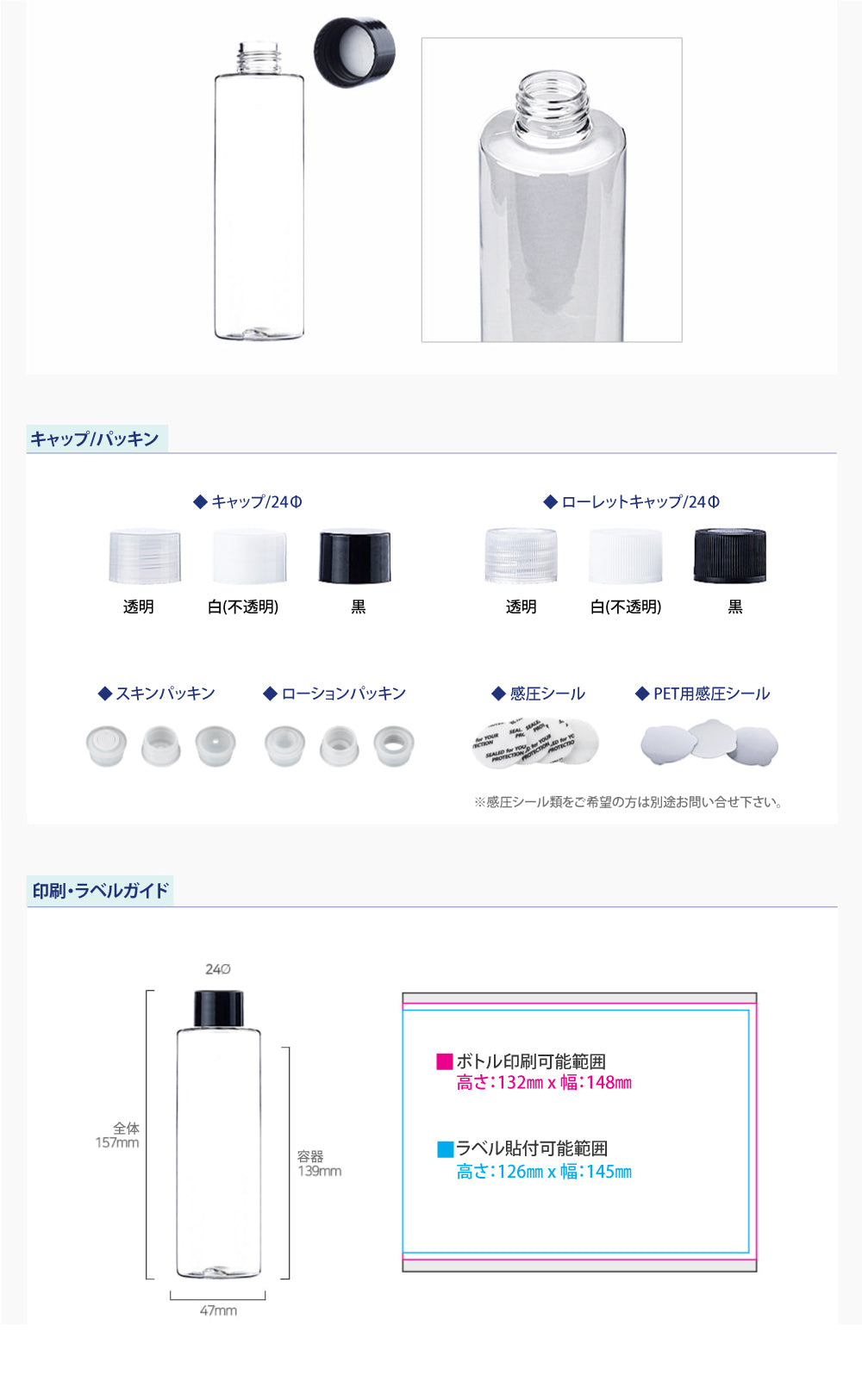 容量:200ml / 口径 : 24φ / 高さ:157mm / 直径 : 47mm