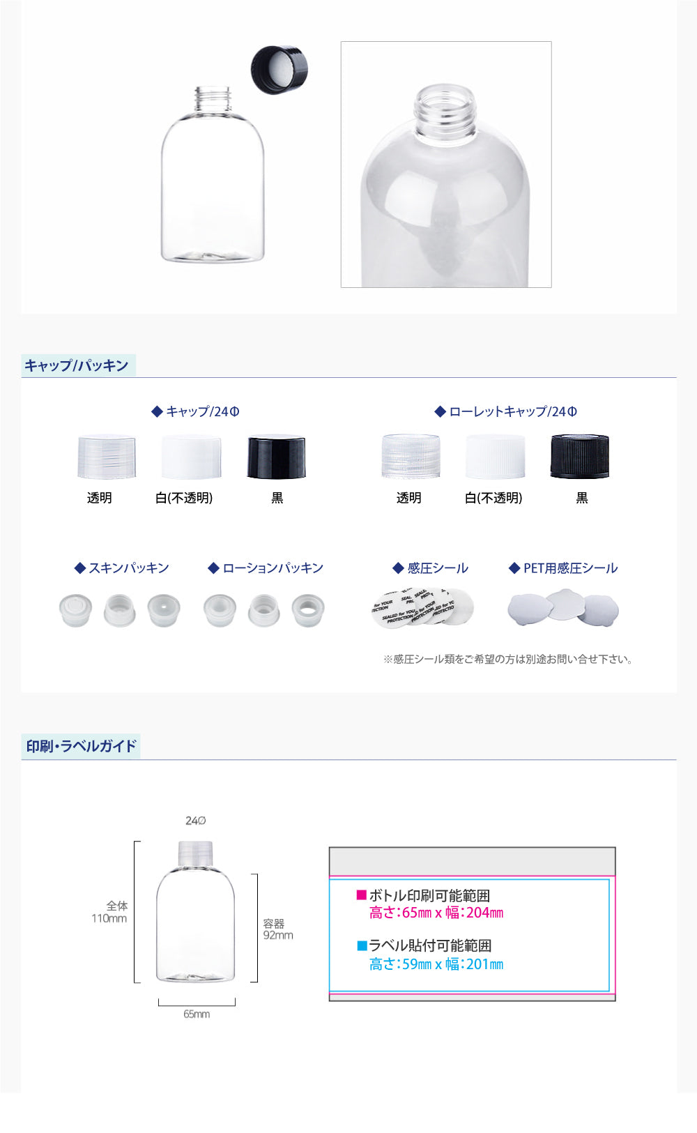 容量:250ml / 口径 : 24φ / 高さ:110mm / 直径 : 65mm