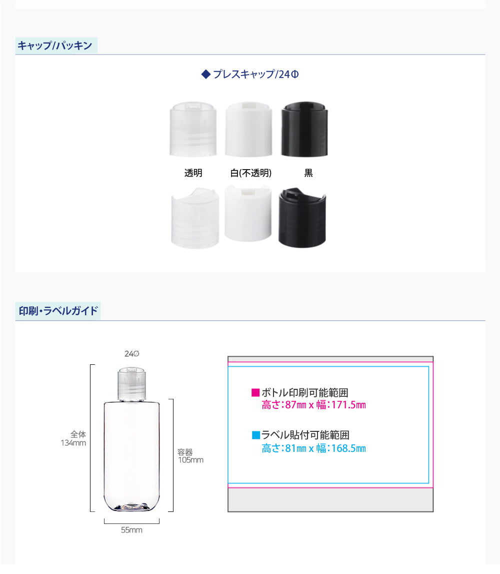 容量:200ml / 口径 : 24φ / 高さ:134mm / 直径 : 55mm