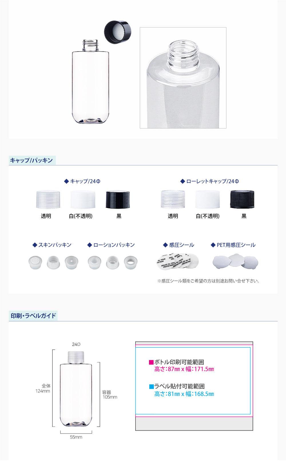 容量:200ml / 口径 : 24φ / 高さ:124mm / 直径 : 55mm