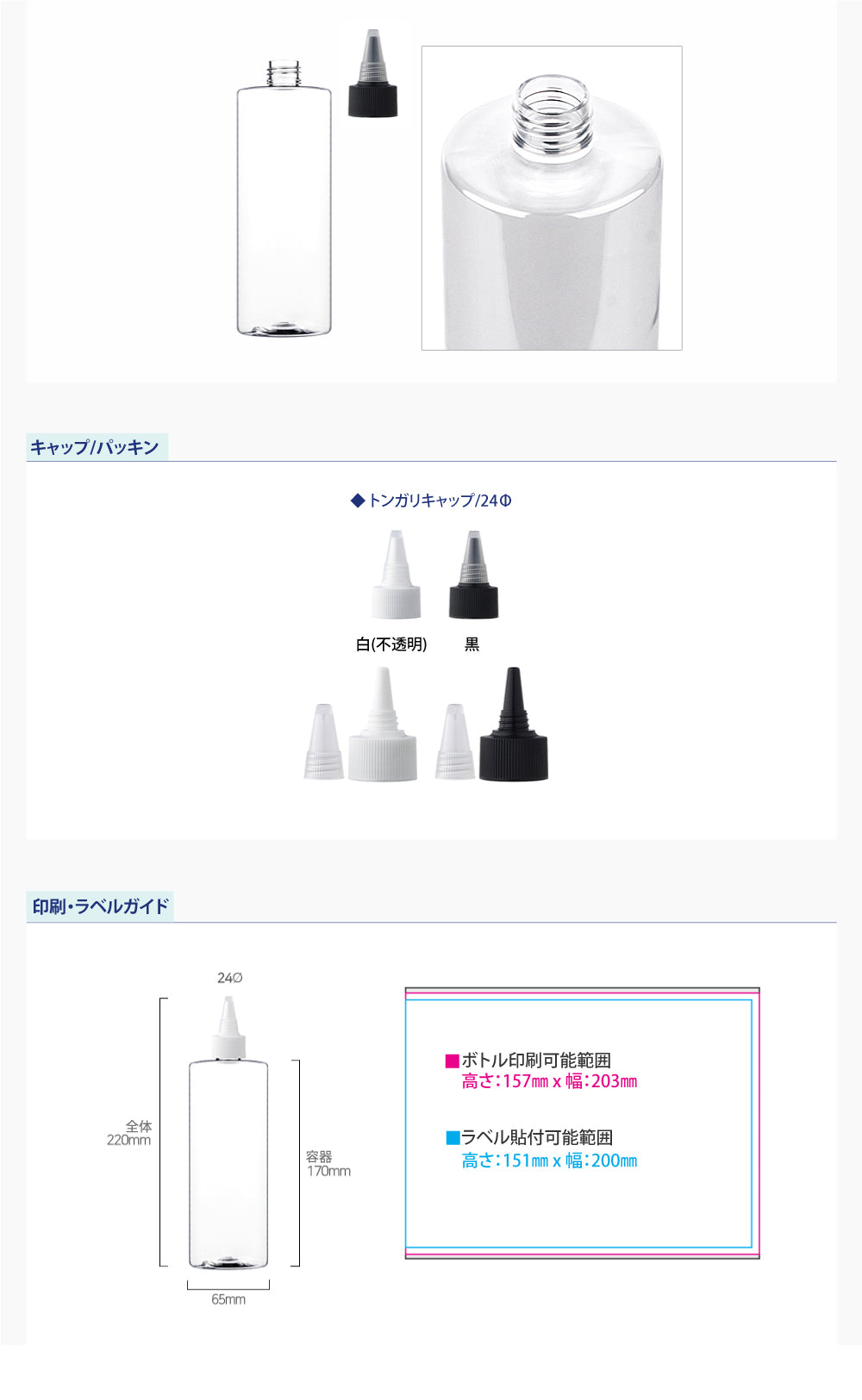 容量:500ml / 口径 : 24φ / 高さ:220mm / 直径 : 65mm