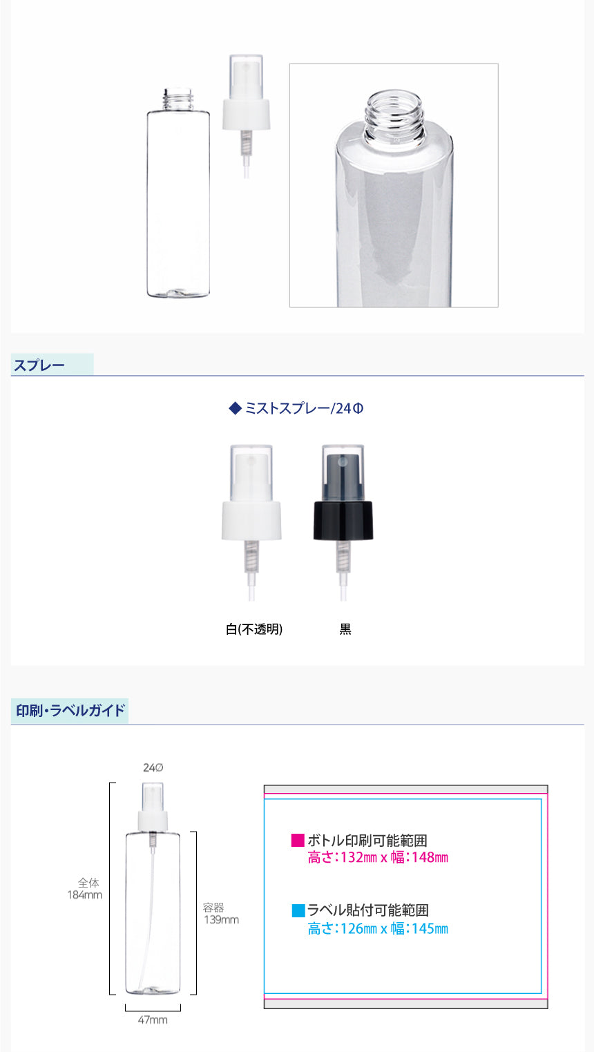 容量:200ml / 口径 : 24φ / 高さ:184mm / 直径 : 47mm