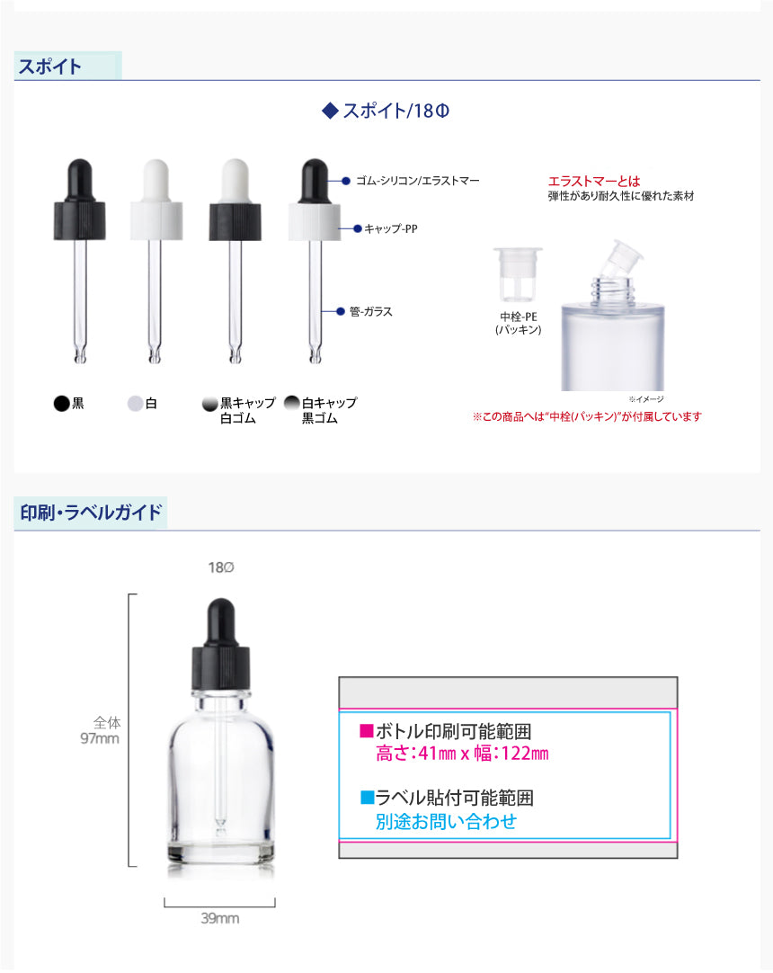 容量:30ml / 口径 : 18φ / 高さ:97mm / 直径 : 39mm