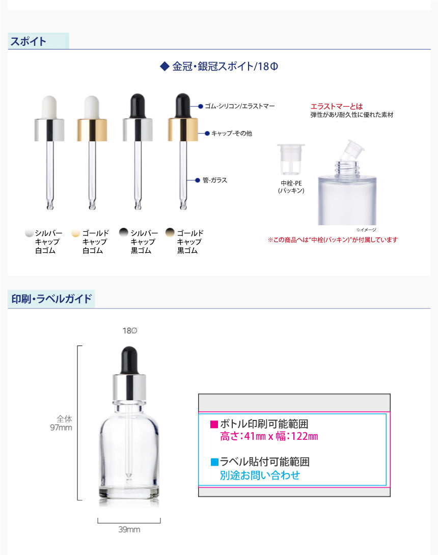 容量:30ml / 口径 : 18φ / 高さ:97mm / 直径 : 39mm