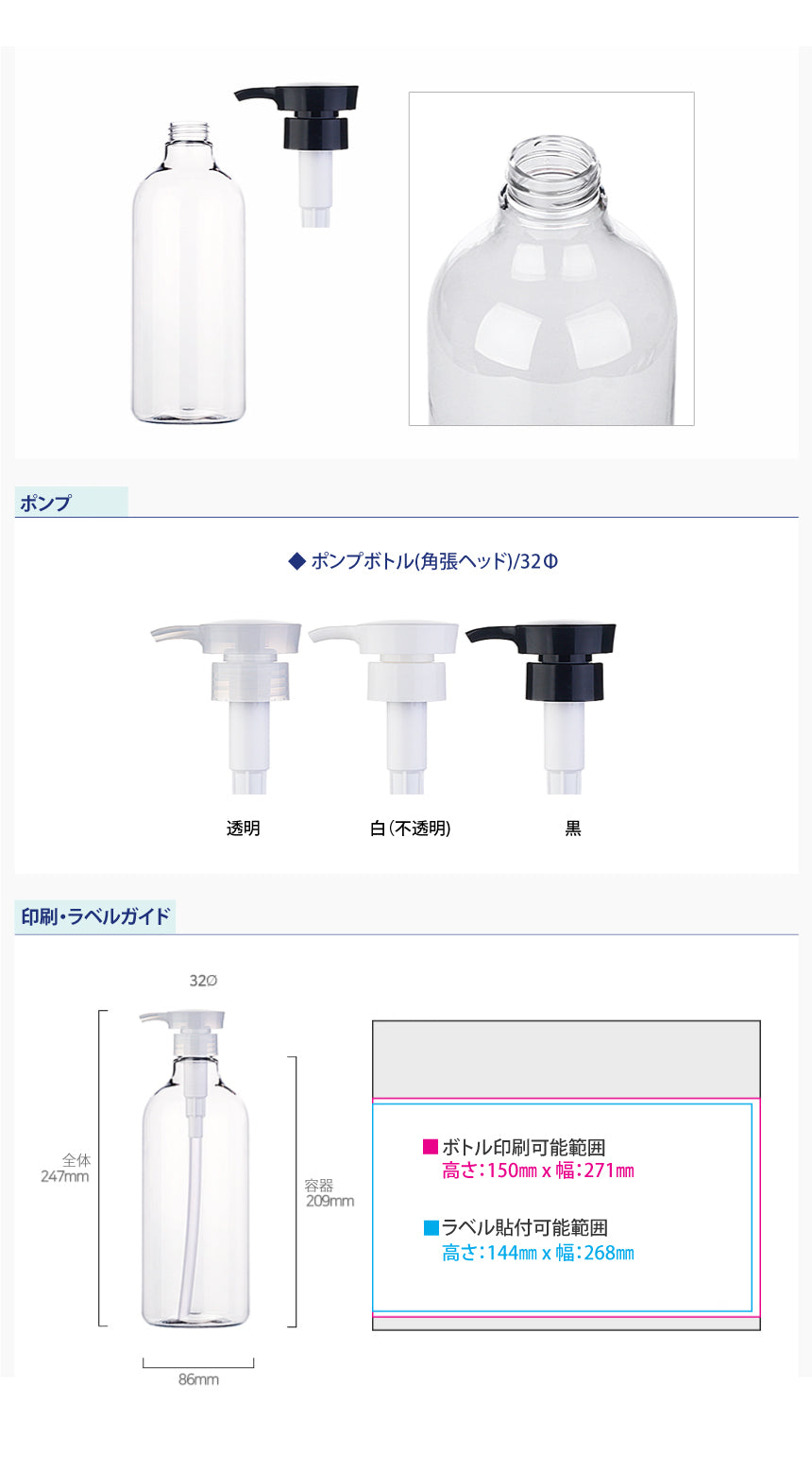 L) ポンプボトル(角張ヘッド) CW1000ml_PET