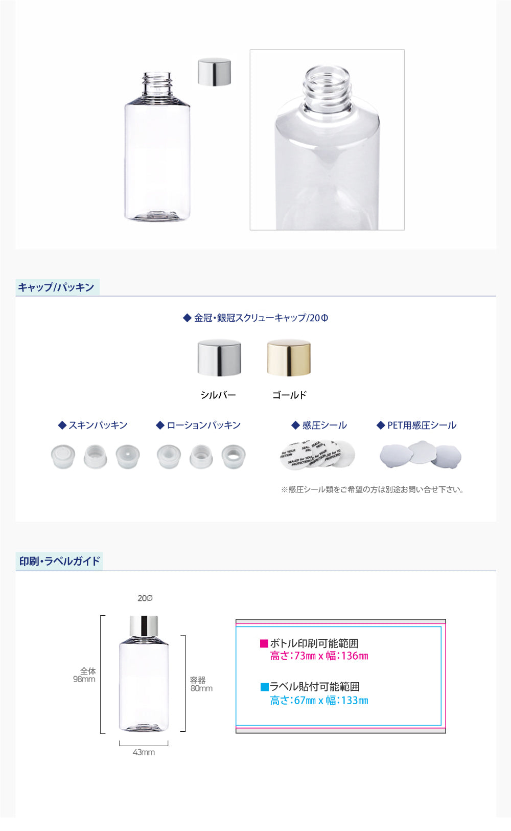 容量:100ml / 口径 : 20φ / 高さ:98mm / 直径 : 43mm