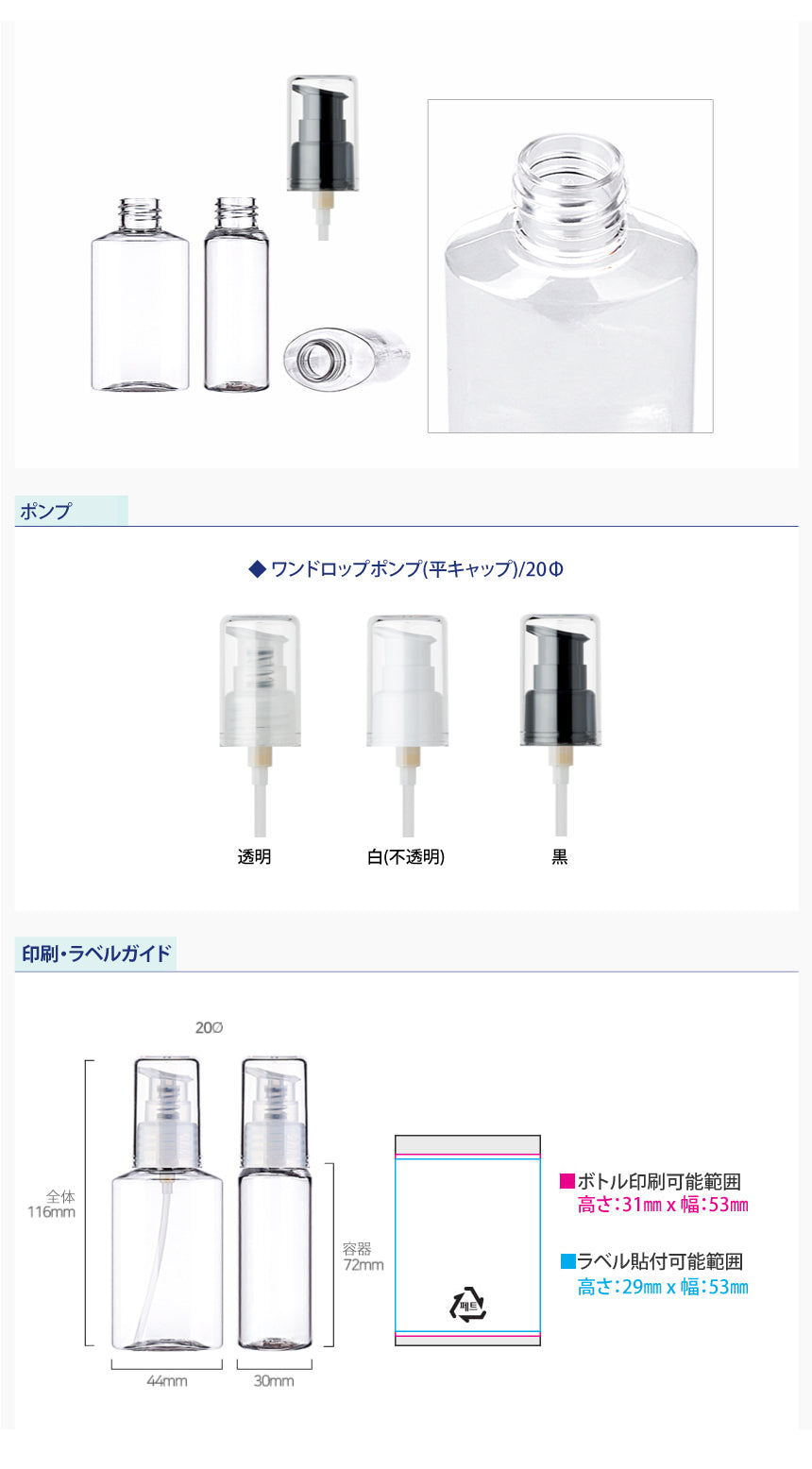 容量:60ml / 口径 : 20φ / 高さ:116mm / 幅 : 44mm / 奥行 : 30mm