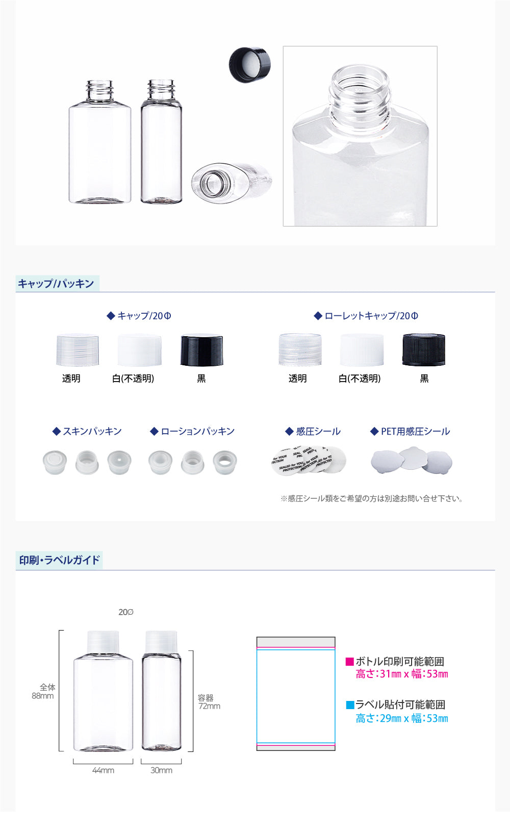 容量:60ml / 口径 : 20φ / 高さ:88mm / 幅 : 44mm / 奥行 : 30mm