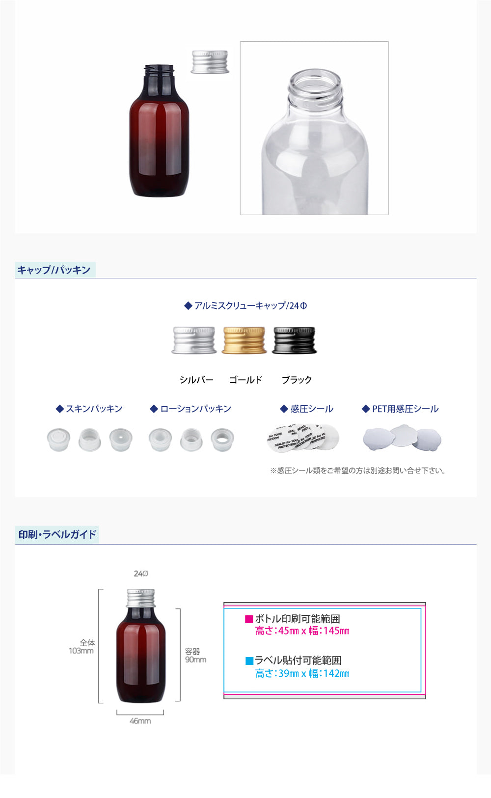 容量:100ml / 口径 : 24φ / 高さ:103mm / 直径 : 46mm