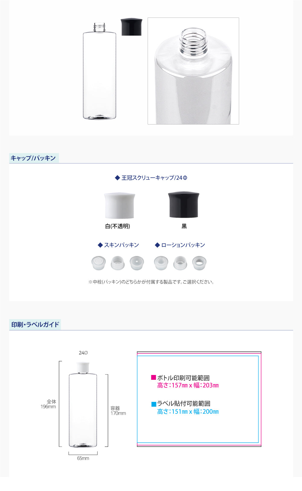 容量:500ml / 口径 : 24φ / 高さ:196mm / 直径 : 65mm