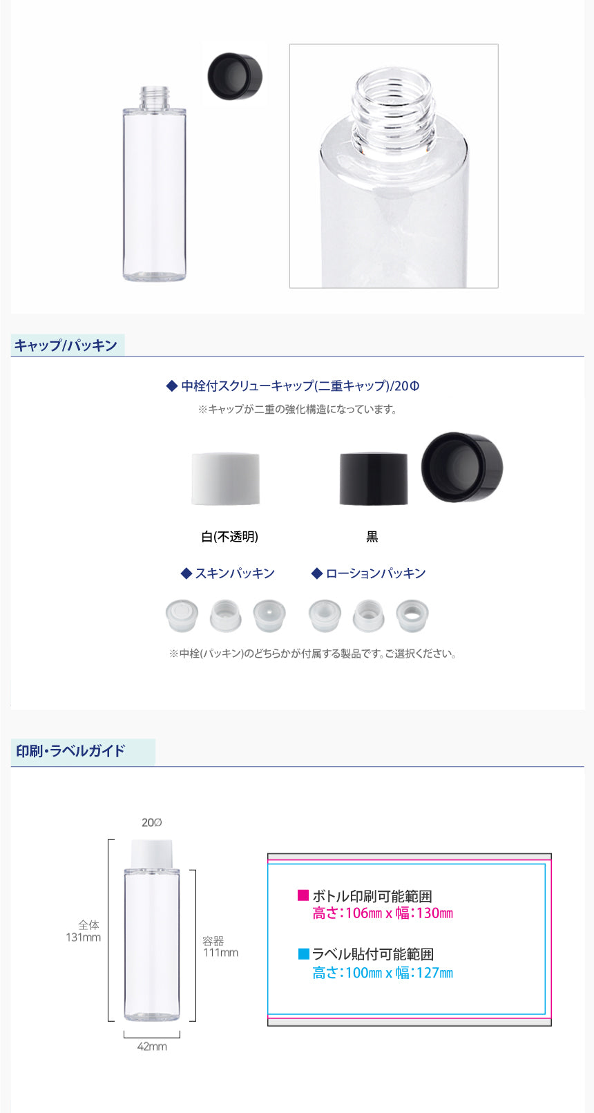 容量:100ml / 口径 : 20φ / 高さ:131mm / 直径 : 42mm