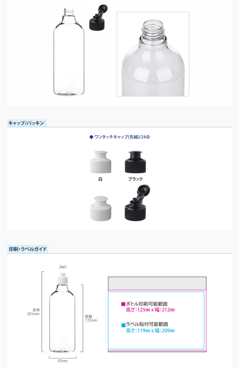 容量:500ml / 口径 : 24φ / 高さ:201mm / 直径 : 67mm