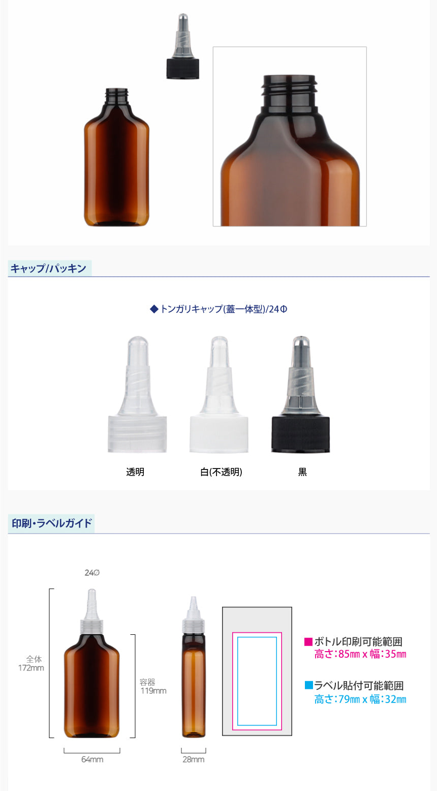 容量:150ml / 口径:24φ / 直径: 64x28mm / 高さ: 172mm